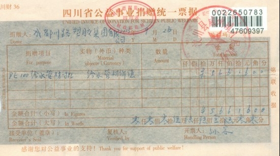川路集團(tuán)再次向汶川捐贈(zèng)5.66萬(wàn)元物資
