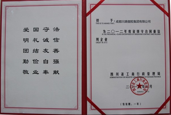 2013-09-11為推動企業(yè)合同信用建設(shè),促進(jìn)社會信用體系的建立和完善, 四川省工商行政管理局根據(jù)《國務(wù)院辦公廳關(guān)于社會信用體系建設(shè)若干意見》和《四川省合同監(jiān)督條例》等相關(guān)文件精神,經(jīng)嚴(yán)格評審、認(rèn)定和公示,授予川路2012年省級“守合同重信用企業(yè)”榮譽(yù)稱號。..全文 -