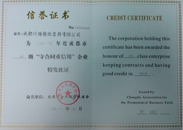 據(jù)“成工商辦[2011]171號(hào)”文件,成都市企業(yè)誠信促進(jìn)會(huì)根據(jù)《四川省合同監(jiān)督條例》和《成都市“守合同重信用”企業(yè)考核認(rèn)定辦法》,授予成都川路塑膠集團(tuán)有限公司為2010年度成都市AA級(jí)“守合同重信用”企業(yè)榮譽(yù)稱號(hào),同時(shí)在成都市企業(yè)信用信息網(wǎng)(http://www.cdcredit.gov.cn/)予以公示。