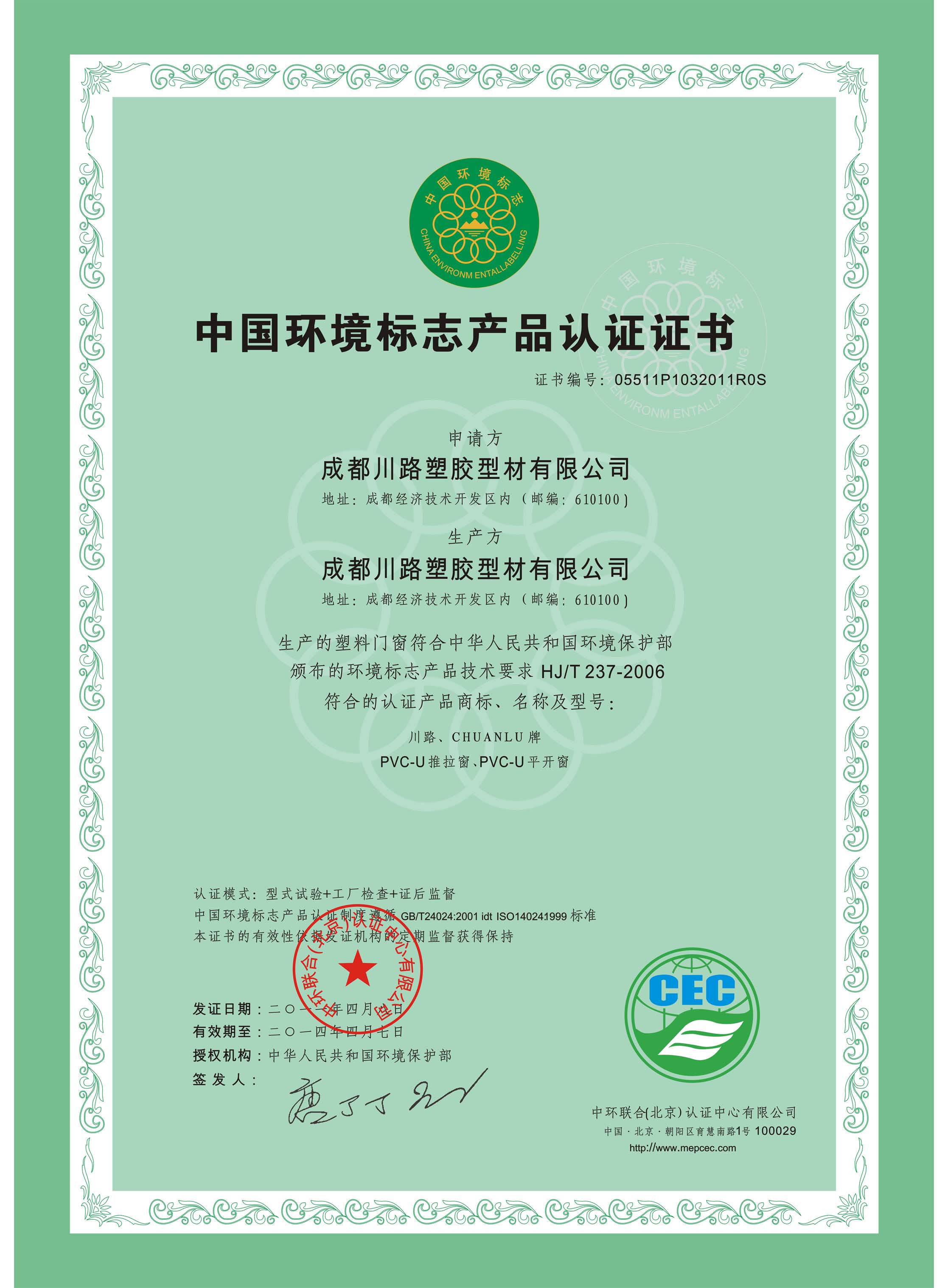 經(jīng)國家環(huán)??偩汁h(huán)境認(rèn)證中心工作人員實地調(diào)研、抽樣、送檢、審核,川路塑膠型材產(chǎn)品通過了中國環(huán)境標(biāo)志產(chǎn)品認(rèn)證,并被授予《中國環(huán)境標(biāo)志產(chǎn)品認(rèn)證證書》。