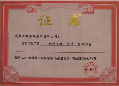 經(jīng)成都市經(jīng)委、市扶持名優(yōu)產(chǎn)品領(lǐng)導(dǎo)小組辦公室等相關(guān)領(lǐng)導(dǎo)對川路塑膠集團的實地考察、調(diào)研和對“川路”牌塑料管材、管件、塑鋼門窗產(chǎn)品的抽查、審核、授予“川路”牌產(chǎn)品為“名優(yōu)產(chǎn)品”榮譽證書。