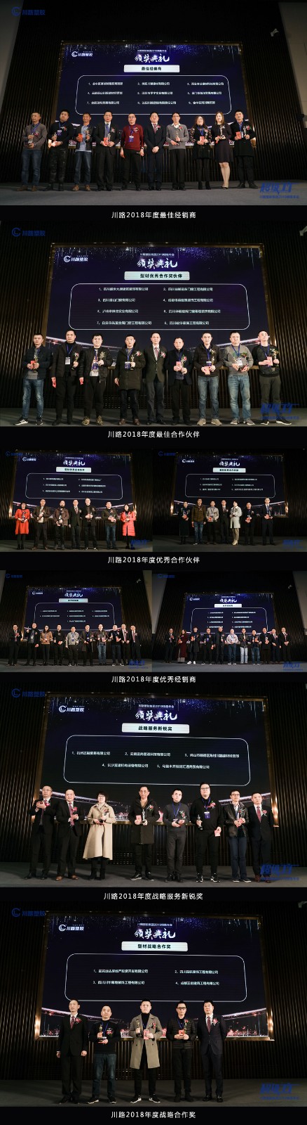會上揭曉了6項年度重磅大獎,川路集團領導為獲獎者們頒發(fā)了獎杯,并舉行了隆重的頒獎儀式。一載又一載的春去秋回,鑄成了川路的參天氣魄,一個又一個的優(yōu)秀經(jīng)銷商、合作伙伴串起了川路輝煌的今天,川路感謝你們的支持。