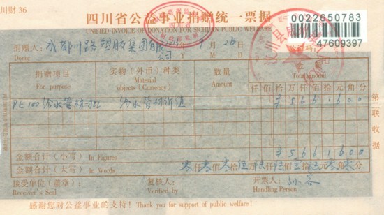 2013年,川路秉承“關(guān)愛(ài)他人、關(guān)愛(ài)社會(huì)、關(guān)愛(ài)自然”的社會(huì)責(zé)任感,于2013年8月7日向汶川縣威州鎮(zhèn)七盤溝社區(qū)捐贈(zèng)一批價(jià)值為56616.00元的飲用水管材,借此表達(dá)愛(ài)心,川路將持續(xù)為災(zāi)區(qū)的更好建設(shè)和持續(xù)發(fā)展貢獻(xiàn)力量。