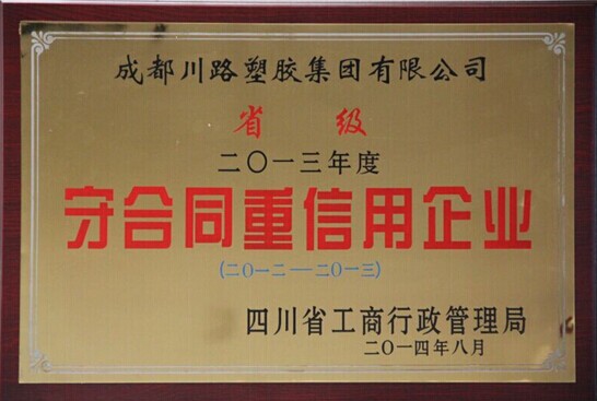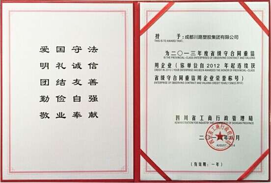 為推動企業(yè)合同信用建設(shè),促進(jìn)社會信用體系的建立和完善,根據(jù)《國務(wù)院辦公廳關(guān)于社會信用體系建設(shè)若干意見》和《四川省合同監(jiān)督條例》等相關(guān)文件精神,經(jīng)嚴(yán)格評審、認(rèn)定和公示,四川省工商行政管理局授予川路2013年“省級守合同重信用企業(yè)”榮譽(yù)稱號。