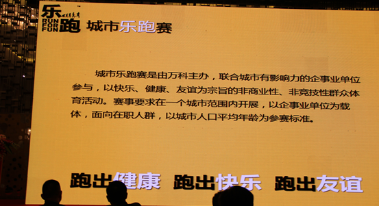 最后,由萬科主辦的以“快樂、健康、友誼”為宗旨的“城市樂跑賽”在全國范圍內(nèi)展開,意在“跑出健康、跑出快樂、跑出友誼”。
