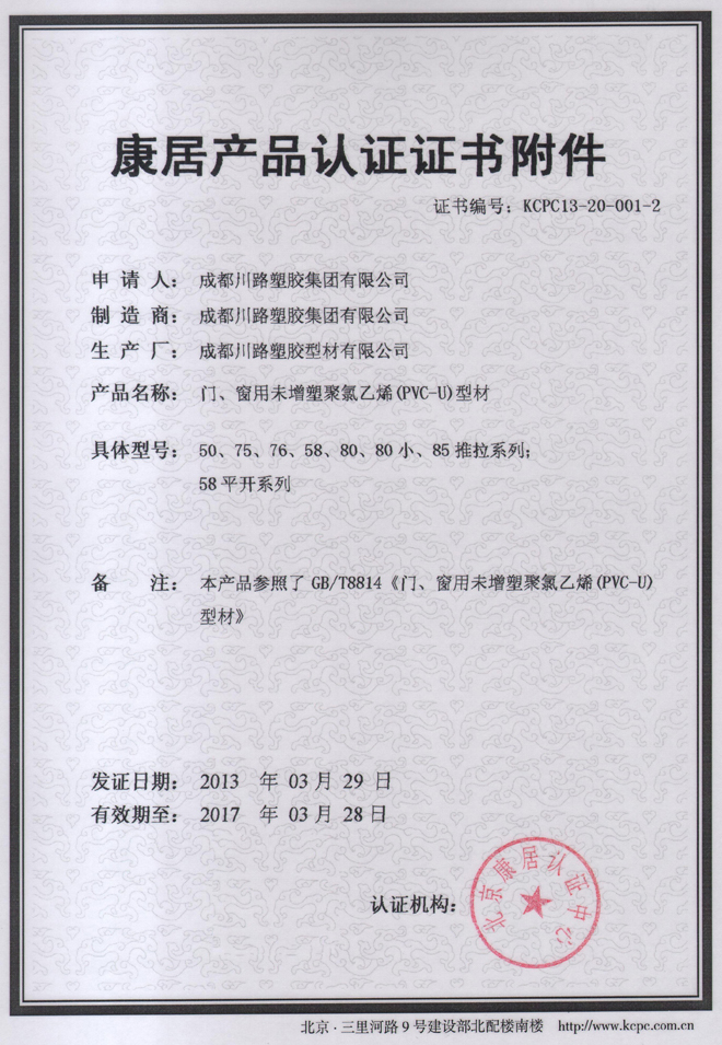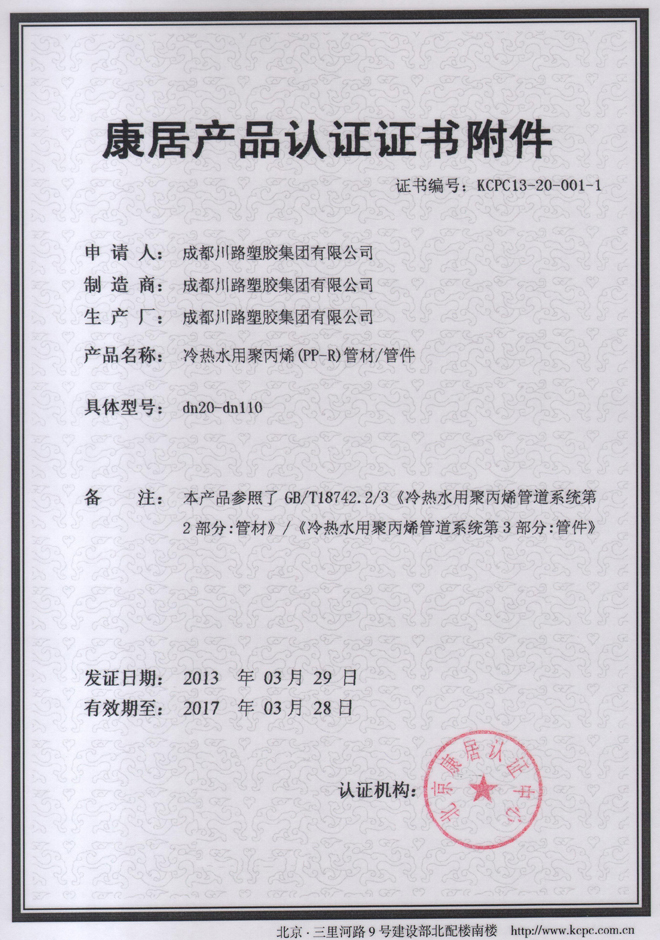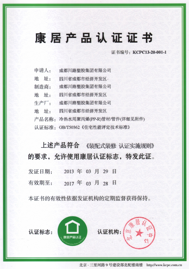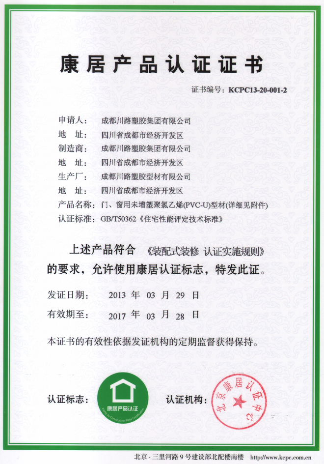 經(jīng)國家康居認(rèn)證中心現(xiàn)場考察、市場調(diào)研、多次抽檢,通過并授予川路塑膠管材、型材產(chǎn)品“康居產(chǎn)品認(rèn)證”證書。我司通過康居認(rèn)證,標(biāo)志著川路產(chǎn)品低碳節(jié)能、健康環(huán)保的特點(diǎn)得到了國家建筑領(lǐng)域的權(quán)威認(rèn)證,川路產(chǎn)品將更廣闊的應(yīng)用于國家康居示范工程,對提高住宅建設(shè)和建筑工程質(zhì)量、加快住宅產(chǎn)業(yè)現(xiàn)代化進(jìn)程有著積極的作用。