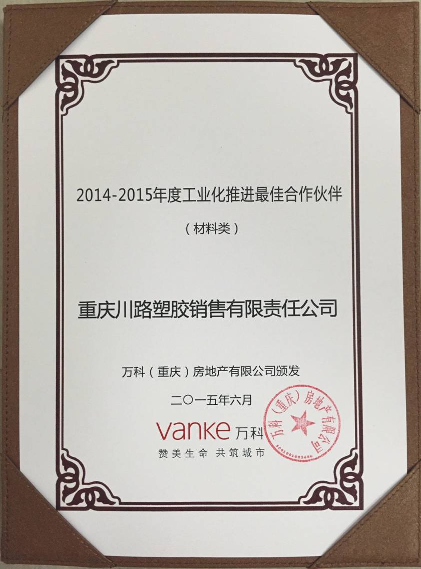 近日,川路塑膠集團(tuán)的榮譽(yù)簿上又增添了濃墨重彩的一筆,川路集團(tuán)重慶分公司榮獲“萬科2014-2015年度工業(yè)化推進(jìn)最佳合作伙伴(材料類)”。再一次的證明了我司產(chǎn)品的品質(zhì)上佳,使用安全放心。
