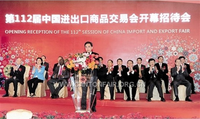 10月14日,第112屆中國(guó)進(jìn)出口商品交易會(huì)(秋季廣交會(huì))開(kāi)幕招待會(huì)在威斯汀酒店舉行,廣交會(huì)主任、廣東省省長(zhǎng)朱小丹,廣交會(huì)副主任、商務(wù)部副部長(zhǎng)蔣耀平,廣交會(huì)副主任、廣東省副省長(zhǎng)招玉芳,廣交會(huì)副主任、廣州市委副書(shū)記、廣州市市長(zhǎng)陳建華等參加招待晚宴。同時(shí)出席的還有國(guó)家相關(guān)部委領(lǐng)導(dǎo)、有關(guān)省市領(lǐng)導(dǎo)和各國(guó)駐華大使館官員及世界各國(guó)駐穗總領(lǐng)事館官員共約430人。